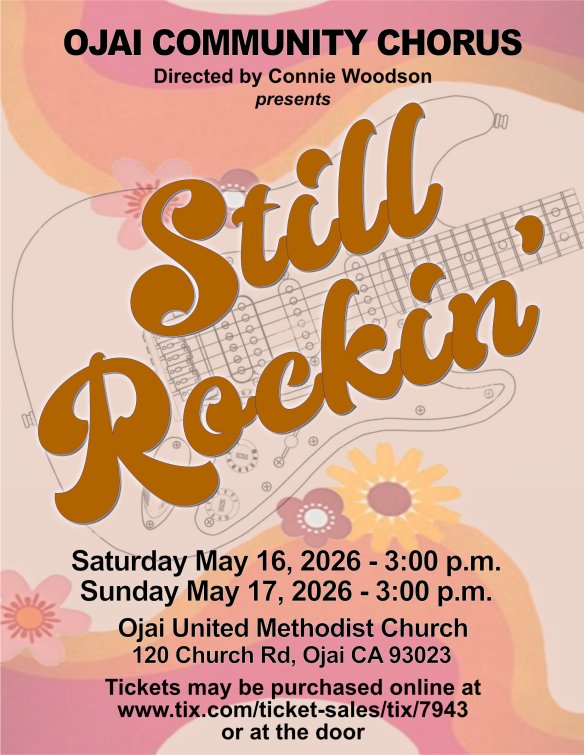 Announcing our Spring Concert to be held Saturday May 16 at 3pm and Sunday May 17 at 3pm. We will be singing a wide variety of pop and rock songs from the 70’s through today. The concert will be held at Ojai United Methodist Church located at 120 Church Road in Ojai, California. Mark you calendar, tell your friends and be sure to attend.